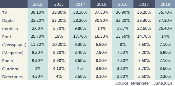 在具体介绍H5营销之前,我想和大家分享一份eMarketer的数据,其中显示了2012年-2018年品牌在不同媒体渠道的预算比重: