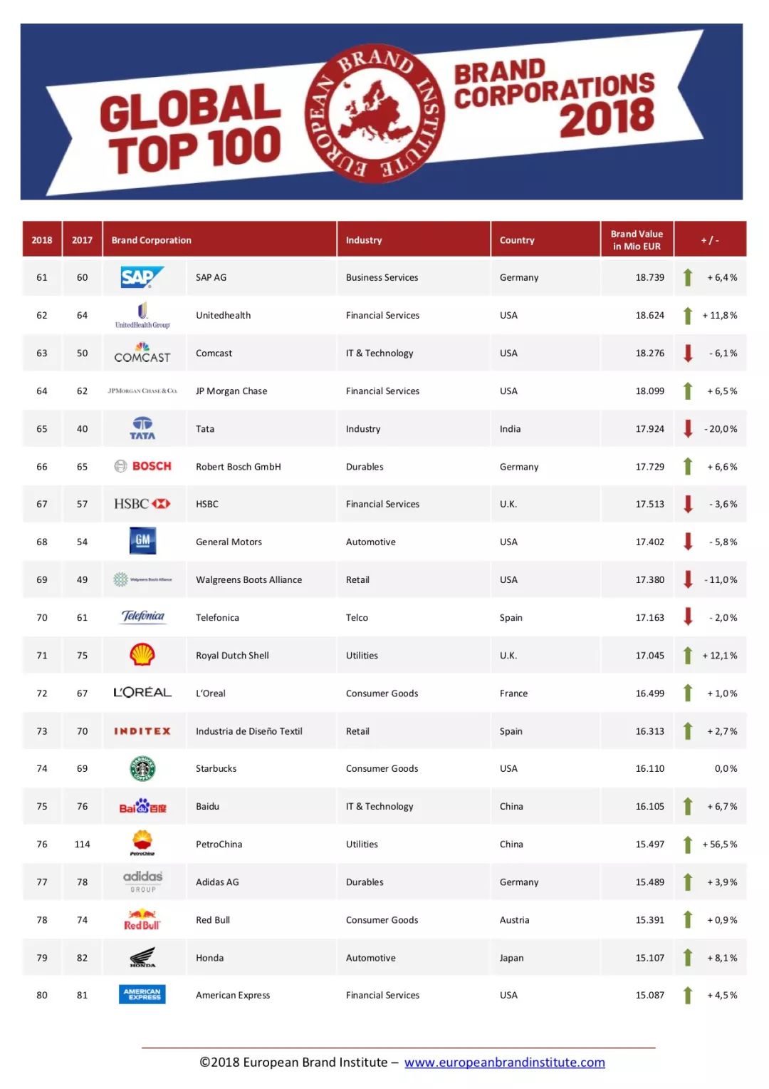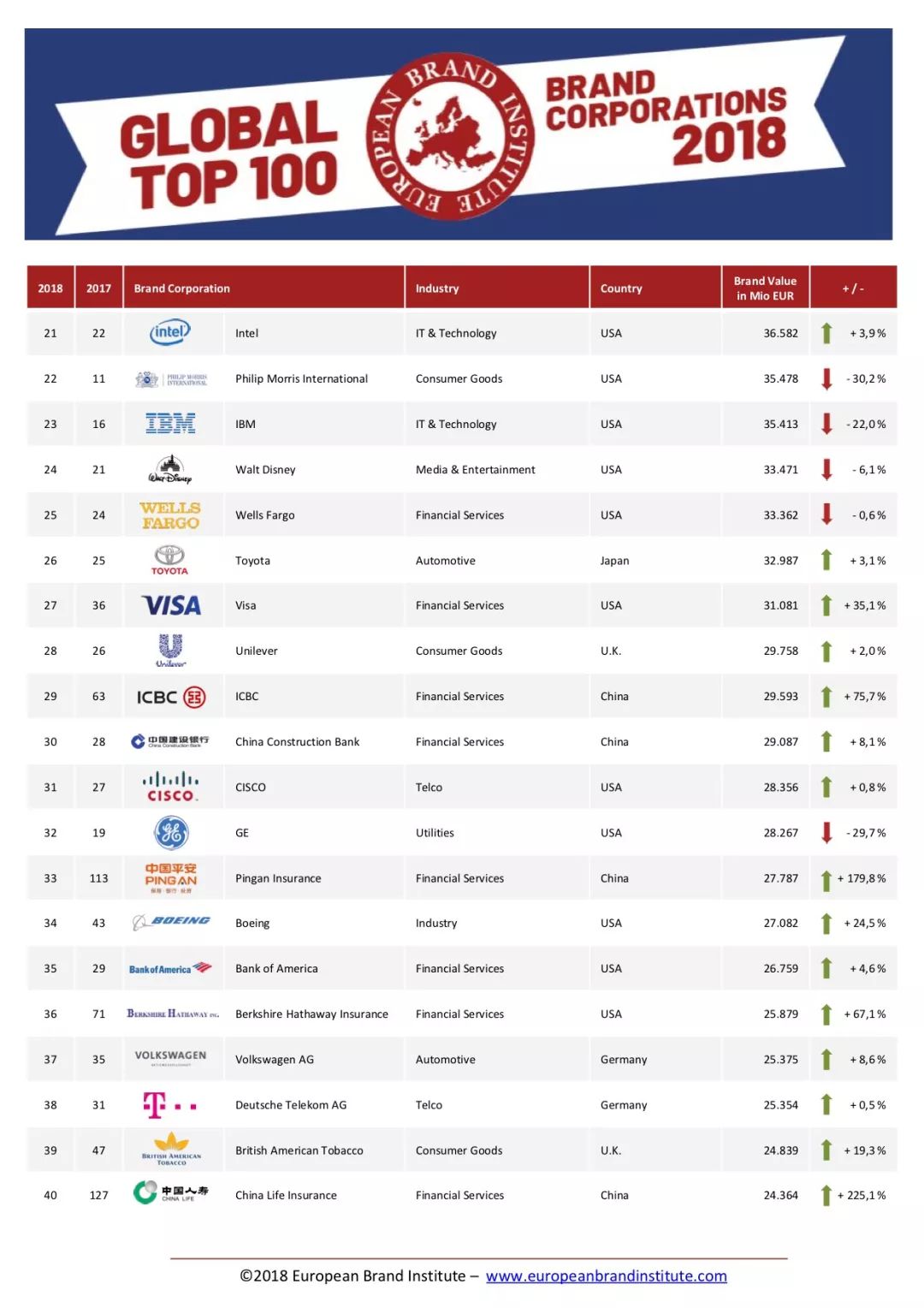 欧洲独立品牌和专利评估专业组织欧洲品牌研究所(EBI)于11月19日发布了《全球企业品牌价值100强报告》(The Global Top 100 Brand Corporations Ranking)。其中,中国有十二家企业进入了榜单。
