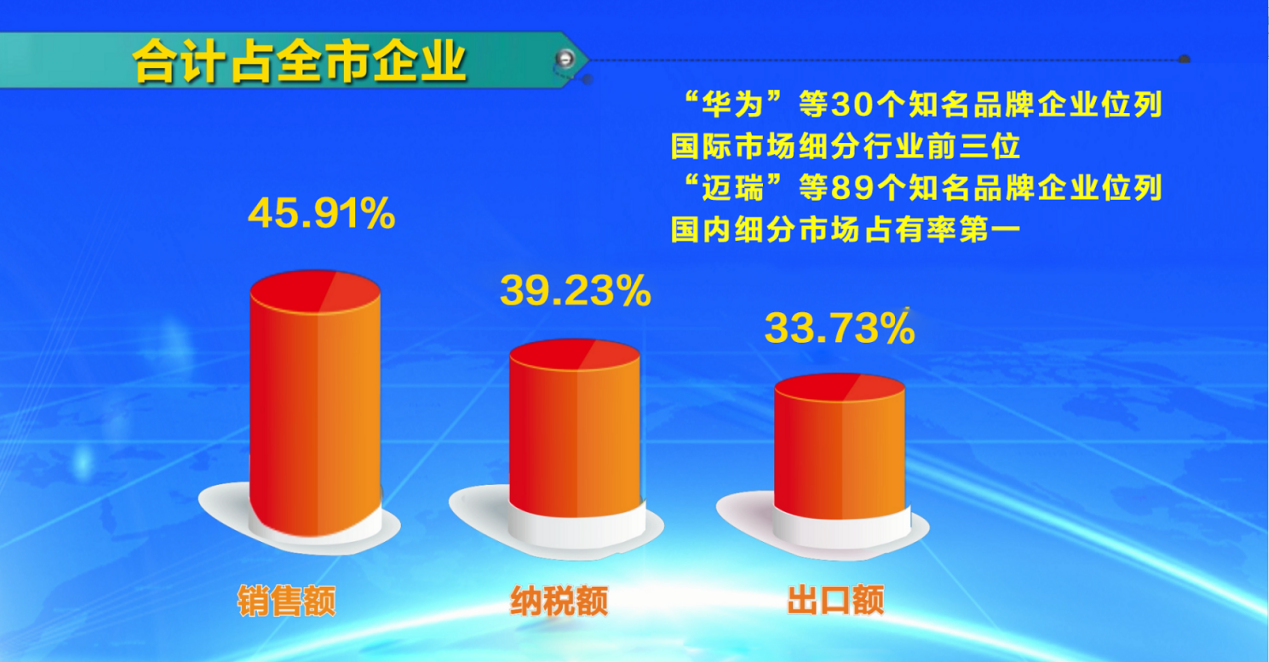 据统计数据测算,仅占全市企业总数0.4‰的这765家企业,销售额合计占全市销售总额的45.91%、纳税额占39.23%、出口额占33.73%。其中“华为”等30个知名品牌企业位列国际市场细分行业前三位;“迈瑞”等89个知名品牌企业位列国内细分市场占有率第一。与联合国工业发展组织共同审定发布了华为、中集、大疆等29个国际信誉品牌。深圳知名品牌已经成为深圳建设国际化创新型城市的靓丽名片,成为推动深圳高质量发展的“排头兵”和“领头羊”。